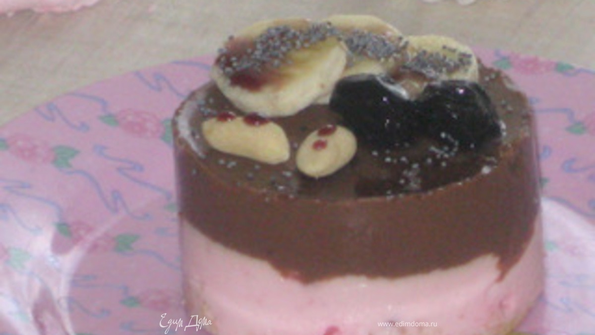 Вырезать из готового бисквита кружочки по диаметру формы и вылить слой йогуртово-клубничного крема. Поставить в холодильник до полного застывания. Затем вылить шоколадно-кофейный крем и опять поставить в холодильник до полного застывания. И украсить по желанию. - Шаг 9