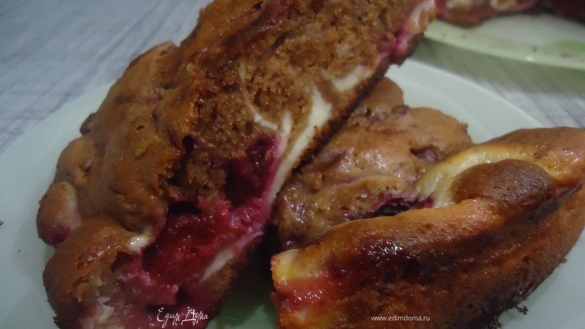 Шоколад поломать на кусочки и растопить вместе с маслом в микроволновке.Взбить миксером 2 яйца , 50г. масла и щепотку соли.Добавить остывший шоколад,разрыхлитель и муку.Всё перемешать до однородности.Тесто готово. Для творожной массы взбить 2 яйца с оставшимся сахаром и творогом. В форму с высокими бортами(у меня силиконовая форма 26см) влить1/3 теста,1/2 творожной массы и 1/2вишни. - Шаг 1