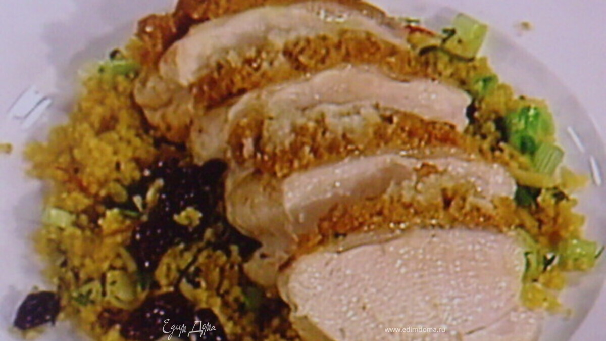Куриная грудка под корочкой из абриксового карри с миндальным кускусом.