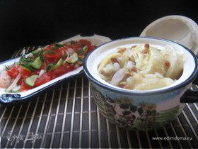 Участник конкурса "Кухни народов мира". Манпар - готовят по всей Средней Азии, с разными вариациями. По преданию, один знатный хан заблудился во время охоты в лесу и набрел на хижину старушки, попросив ночлега и еды. А у той, в силу своей бедности, ничего не оказалось. Тогда она замесила тесто из муки и воды, растянула его в ленты и нарвала руками на маленькие кусочки, которые отварила. Собрав овощей на своем огородике, она их обжарила и добавила в воду с тестом. Хану эта еда показалась самой вкусной на свете.