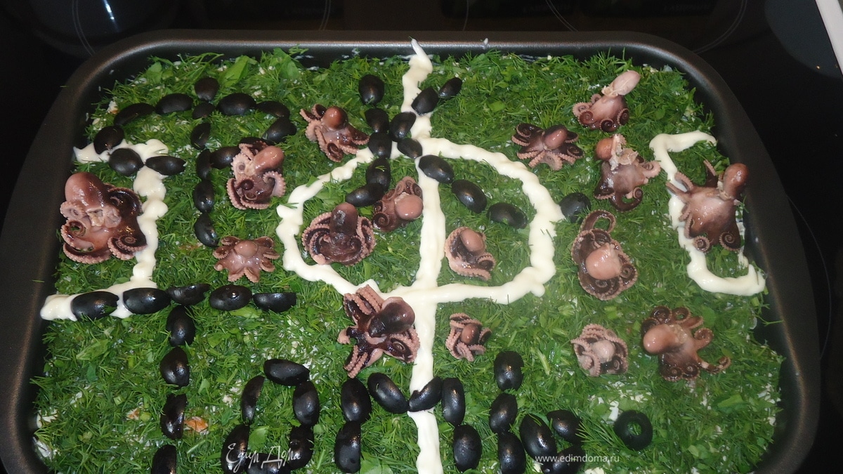 - Шаг 11Укроп режем мелко и выкладываем на салат чтоб получилось зеленое поле тонкой струйкой майонеза чертим полосы круг по середине ворота оливки разрезаем на 4 части и выкладываем слова «ФК "Томь"» осьминогов расставляем по полю.