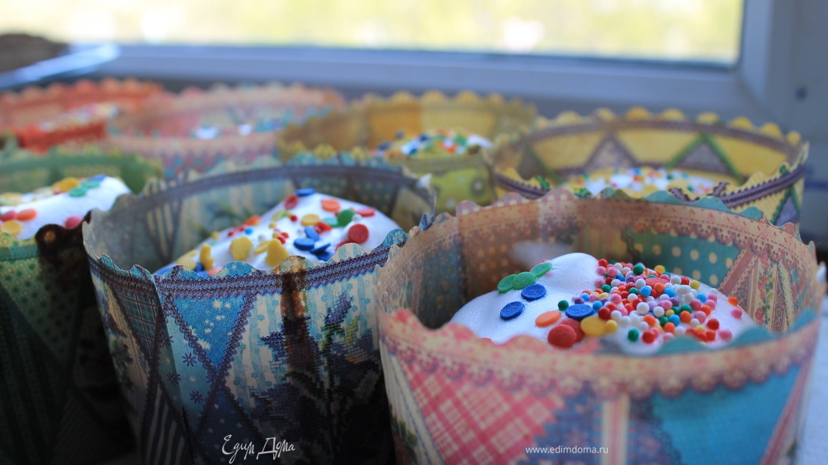 - Шаг 4Белки взбить с сахаром до пиков. Намазать слегка остывшие кексы и посыпать кондитерской посыпкой.