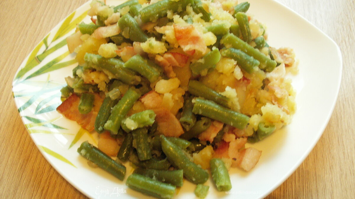 - Шаг 2Картофель очищаем и рубим ножом прямо в салатнике, солим, перчим, поливаем маслом. Добавляем фасоль и бекон с луком. Перемешиваем. Подаем в горячем виде. BON APPETIT!