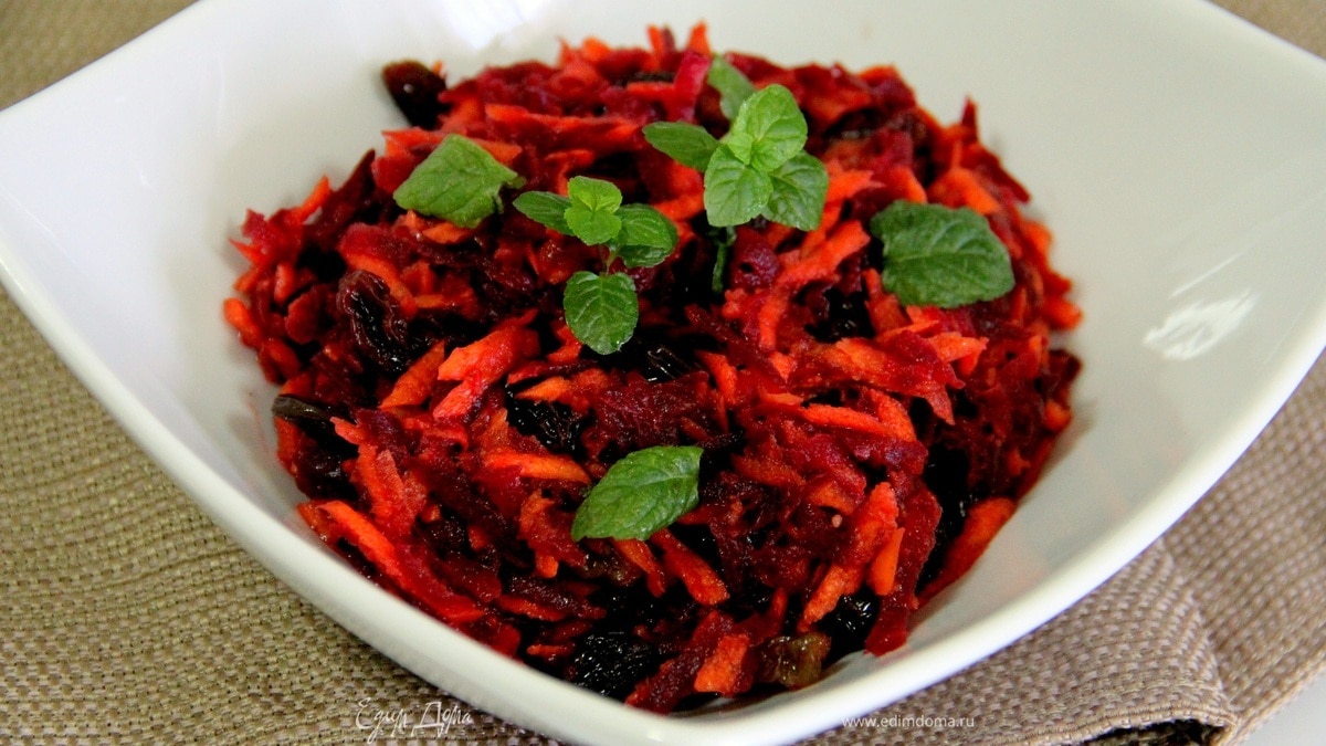 Затем немного подсушить свеклу с помощью бумажного полотенца и добавить к моркови. Туда же добавляем изюм и перемешиваем. - Шаг 3