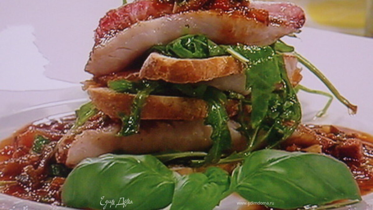 теперь очередь соуса рататуй. Им полить блюдо сверху и немного по бокам тарелки. Украсить базиликом. Приятного аппетота !