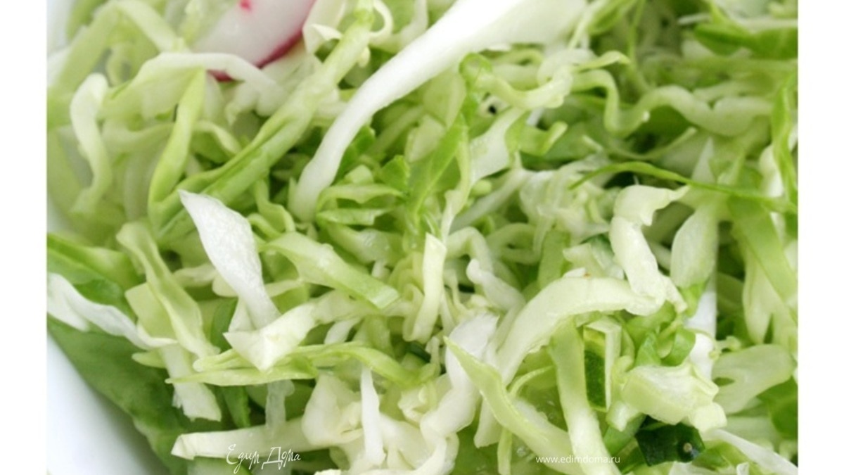 - Шаг 1Молодую капусту нашинковать, огурцы и редис нарезать соломкой.