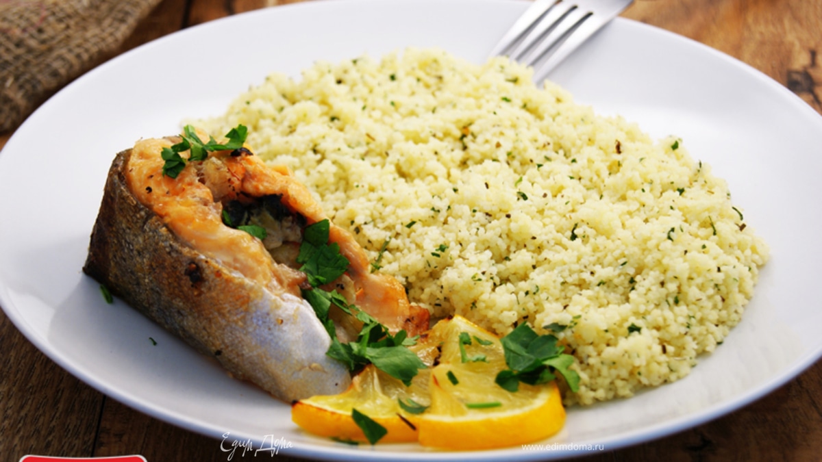 - Шаг 3Подавать, выложив рыбу на кускус и посыпав её нарезанной петрушкой.