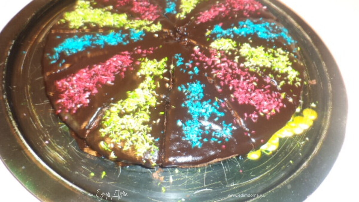 Разрезать корж треугольниками. Украсить треугольники разноцветной кокосовой стружкой. Приятного аппетита!!!