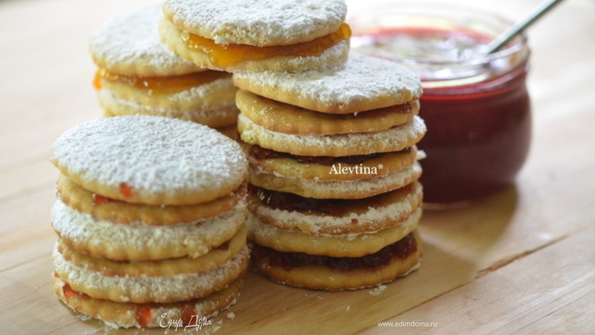 Затем смазываем печенье джемом или вареньем , закрываем вторым . Выкладываем на стол. Посыпаем сахарной пудрой. - Шаг 9