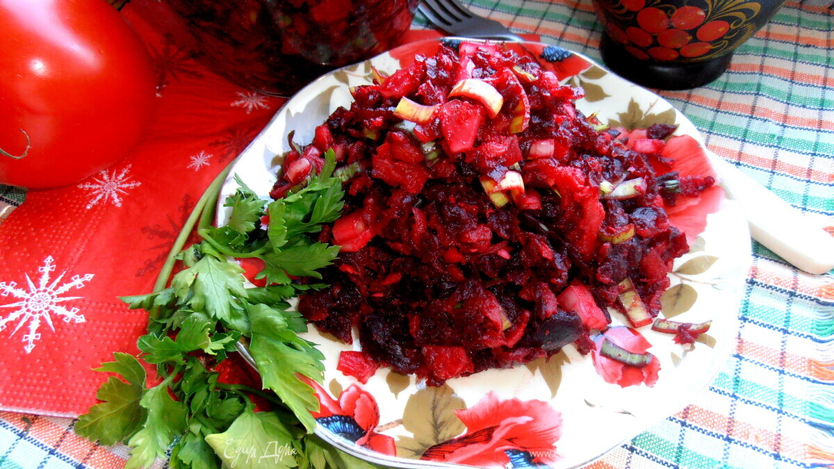 Такой салат "а-ля винегрет" отлично впишется в дачную кухню...Без жирных заправок...(но,кто хочет,может и растительного масла добавить!),с пикантным хренчиком,который я часто добавляю в различные салаты...