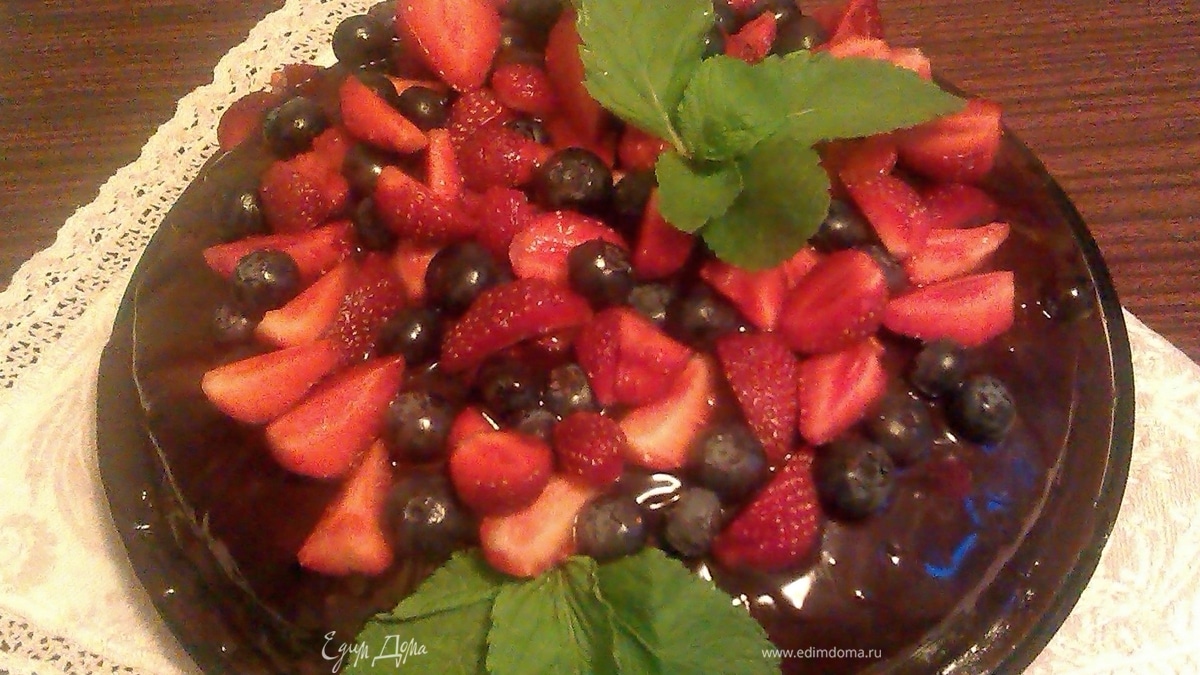 - Шаг 3Бисквит полить глазурью, дать ей немного остыть. Нарезать клубнику, перемешать с голубикой, выложить на торт. Украсить листиками мяты. Корж можно разрезать на коржи и промазать. Фантазируйте.