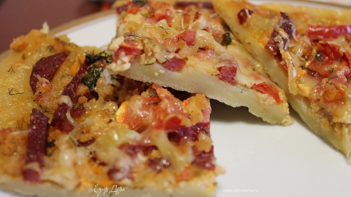 Недавно я пекла плюшки из картофельного теста от Танюшки.)) И у меня осталось много теста и немного начинки.. Я решила испечь пиццу. Угощайтесь!!))