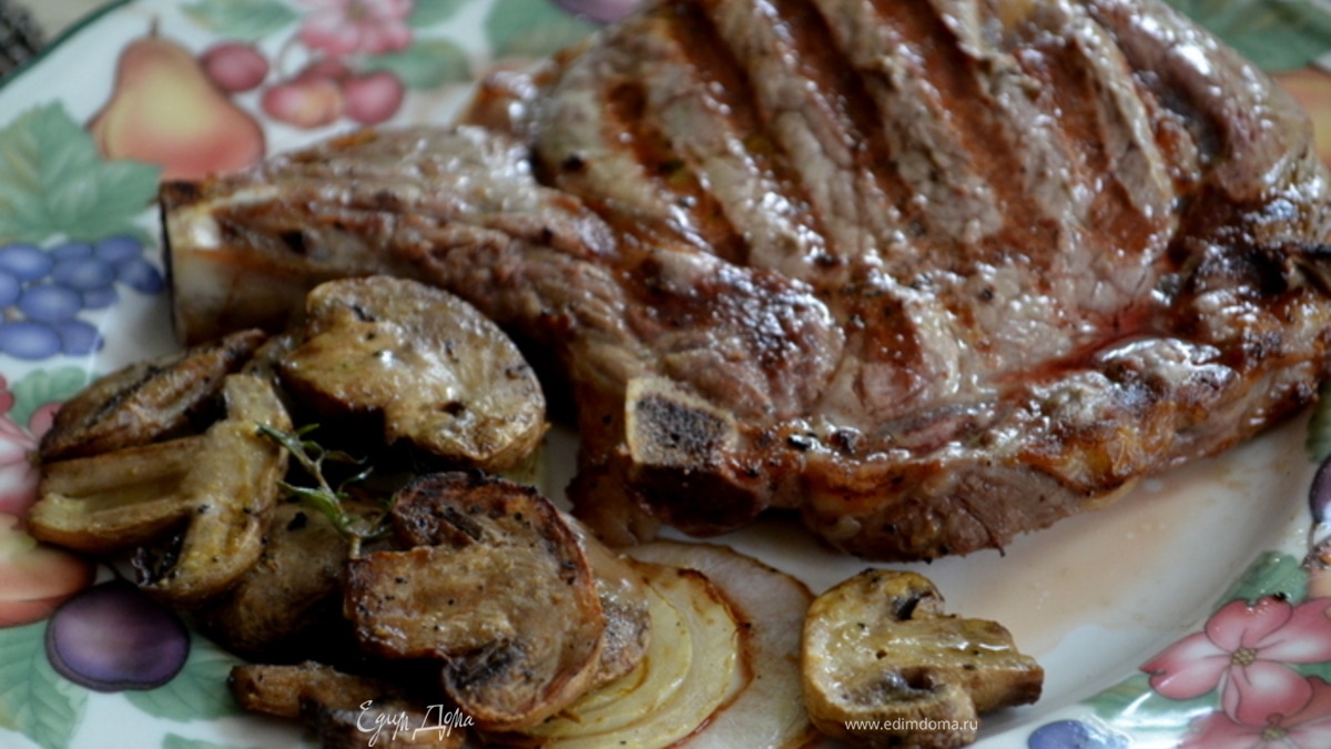 Рибай стейк с грибами и луком