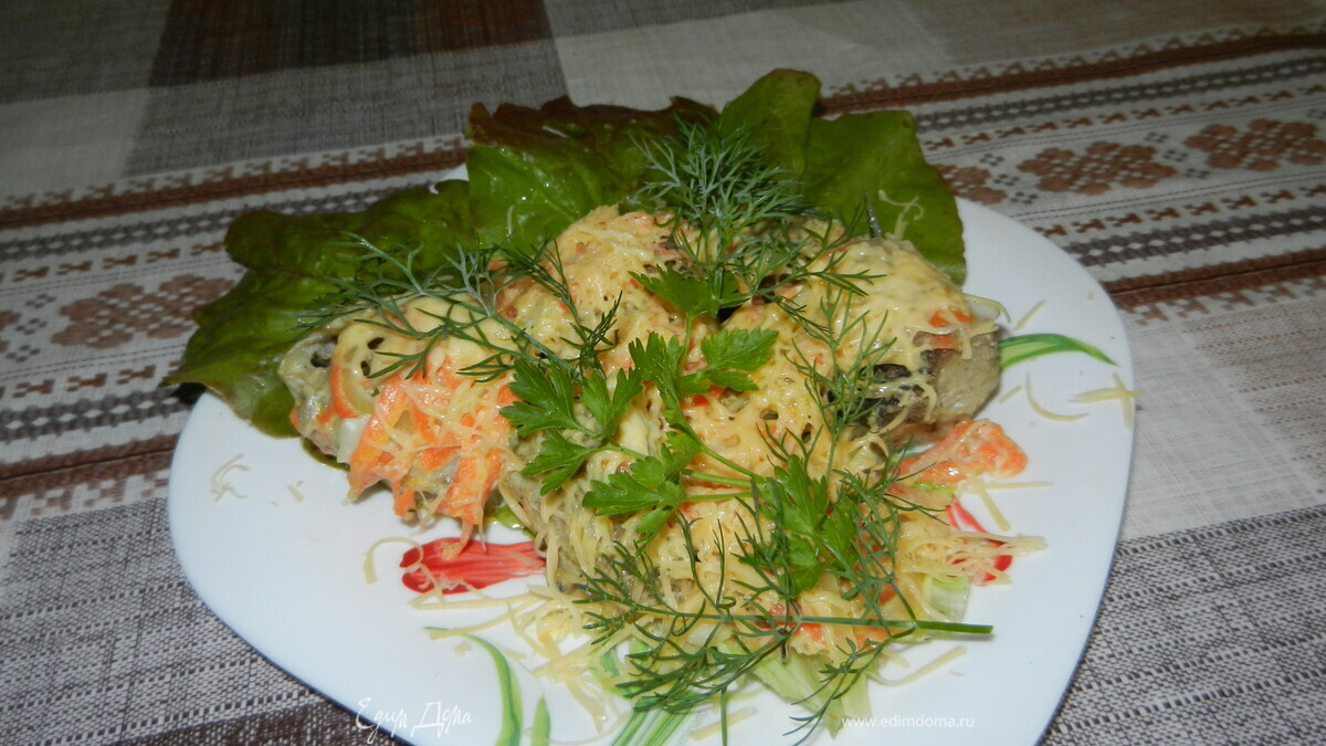На тарелочку с листьями салата выкладываем нашу рыбку и посыпаем тертым сыром. Накрываем все глубокой тарелкой, чтобы растаял сыр. Через несколько минут убираем тарелочку и украшаем зеленью. ВУАЛЯ!!