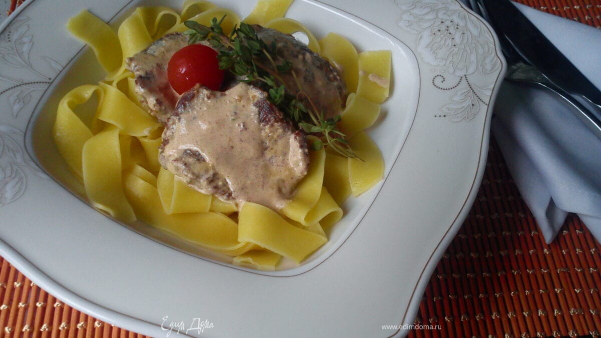 Выкладываем на тарелку лапшу, а сверху телятину и поливаем соусом. Приятного аппетита!