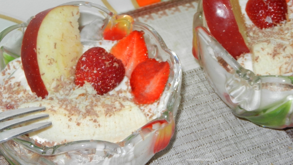 Смесь накладываем в порционные салатницы и накрываем слоем взбитых сливок.