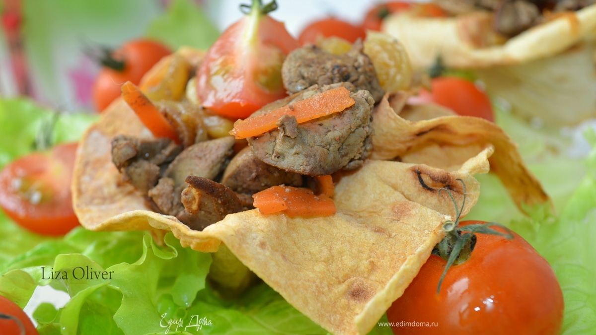 Теплый салат из куриной печени и овощей в хрустящих корзинках