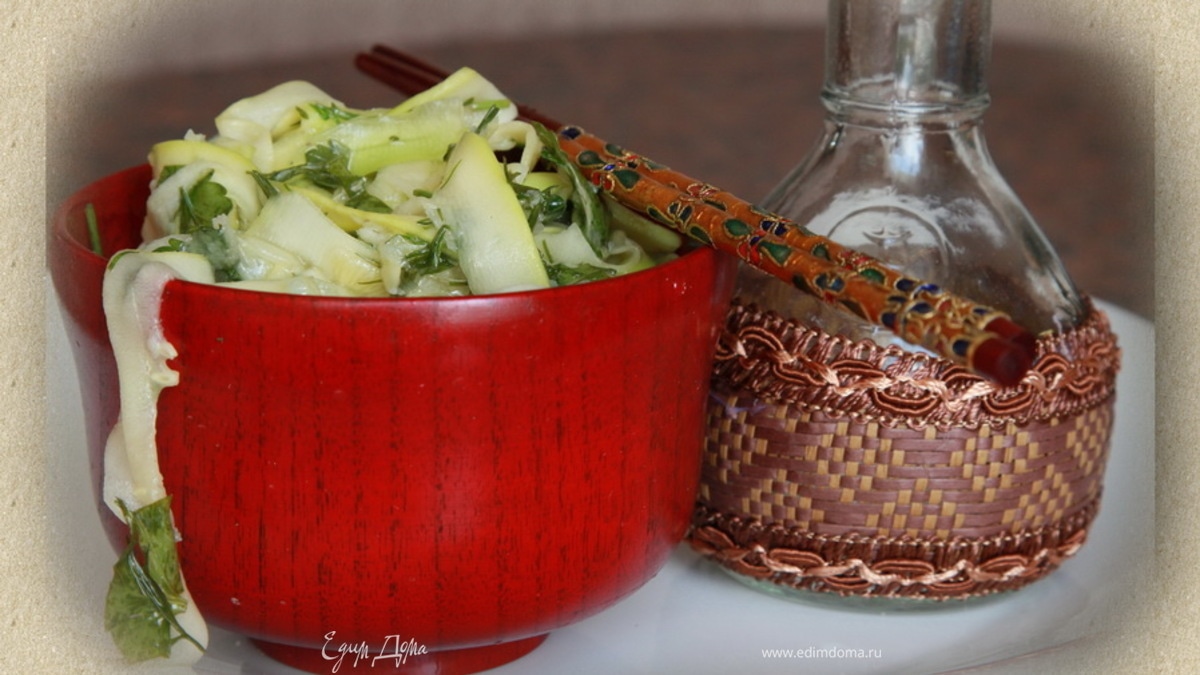 Кабачки очищаем от кожуры и семян, нарезаем тонкими полосками любым удобным способом. Я ножичком для чистки овощей. - Шаг 2