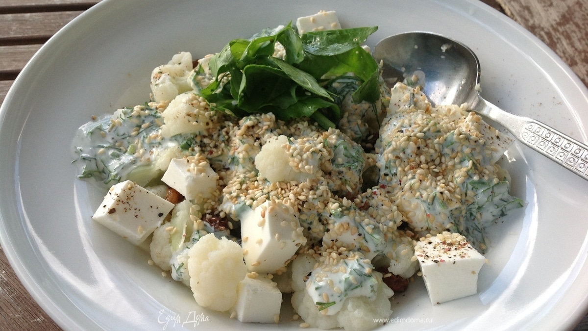 Я очень люблю цветную капусту! У меня есть несколько рецептов любимых блюд с ней. Увидела оригинальный рецепт салата в журнале.... Понравилось, что заправка такая диетическая, если еще брать сметану не жирную, то можно подумать о фигуре )))) Сыр в салате можно с легкостью заменить на фету или брынзу.