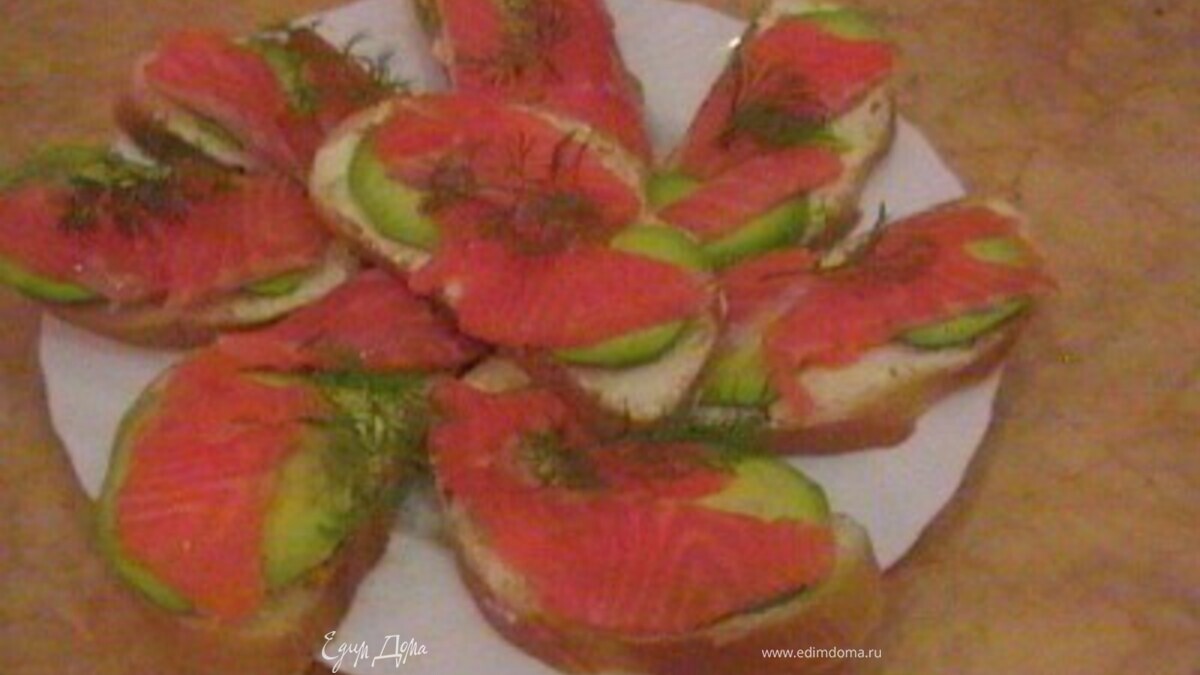 - Шаг 1Сначала на хлеб выложить авокадо, можно даже его растереть и намазать как масло, а сверху тонкий кусочек семги. Ну и можно украсить укропом.