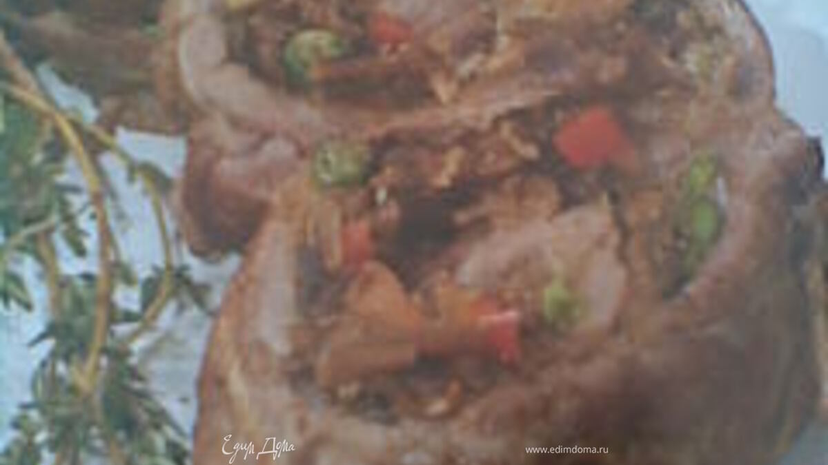 - Шаг 11. Грибы замочить в теплой воде на 10мин.,затем отбросить на дуршлаг и крупно нарезать.Лук очистить и нарезать тонкими полукольцами.Обжарить лук в 1ст.лож разогретого раст.масла,4мин.Добавить грибы и готовить на среднем огне,переодически помешивая,6мин.Снять с огня и дать остыть. 2. Каждую отбивную отбить в тонкий пласт.Посолить,поперчить,смазать небольшим количеством масла и отложить. 3. Перец разрезать пополам,удалить серцевину,мякоть нарезать небольшими кусочками.Помидор опустить в кипящую воду на 1мин.,затем вынуть,обдать холодной водой и снять кожицу:мякоть измельчить.Смешать в миске овощи,добавить зеленый горошек и остывшие грибы с луком.Посолить,поперчить,перемешать. 4. Разложить на рабочей поверхности отбивные так,чтобы они слегка находили друг на друга и вместе образовали прямоугольник.Ровным слоем распределить по мясу начинку.Свернуть в рулет. 5. Перевязать рулет в нескольких местах бечевкой.В большой сковороде разогреть 2ст.лож раст.масла,обжарить рулет,часто переворачивая,8мин. 6. Противень накрыть листом фольги.Положить в центр рулет,у фольги приподнять края так,чтобы получилась лодочка.Влить в лодочку грейпфрутовый сок.Сомкнуть края фольги.Поставить противень в разогретую до 200'С духовку.Готовить 40мин. Вынуть рулет из духовки,дать постоять 15мин.,затем снять фольгу и нарезать рулес порционными кусками.