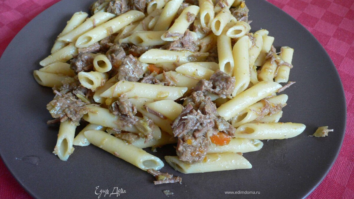 За полчаса до готовности толчем мясо деревянной лопаткой, оно должно легко поддаваться, так как к этому времени достаточно растушено. Варим макаронные изделия, и готово )) осталось только перемешать их с мясом.