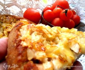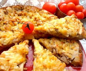 Посыпаем сыром на горячую начинку! Я убрала в таком виде обратно в уже выключенную духовку на несколько минут для расплавления сыра...,но можно и запечь сыр,кто хочет)))