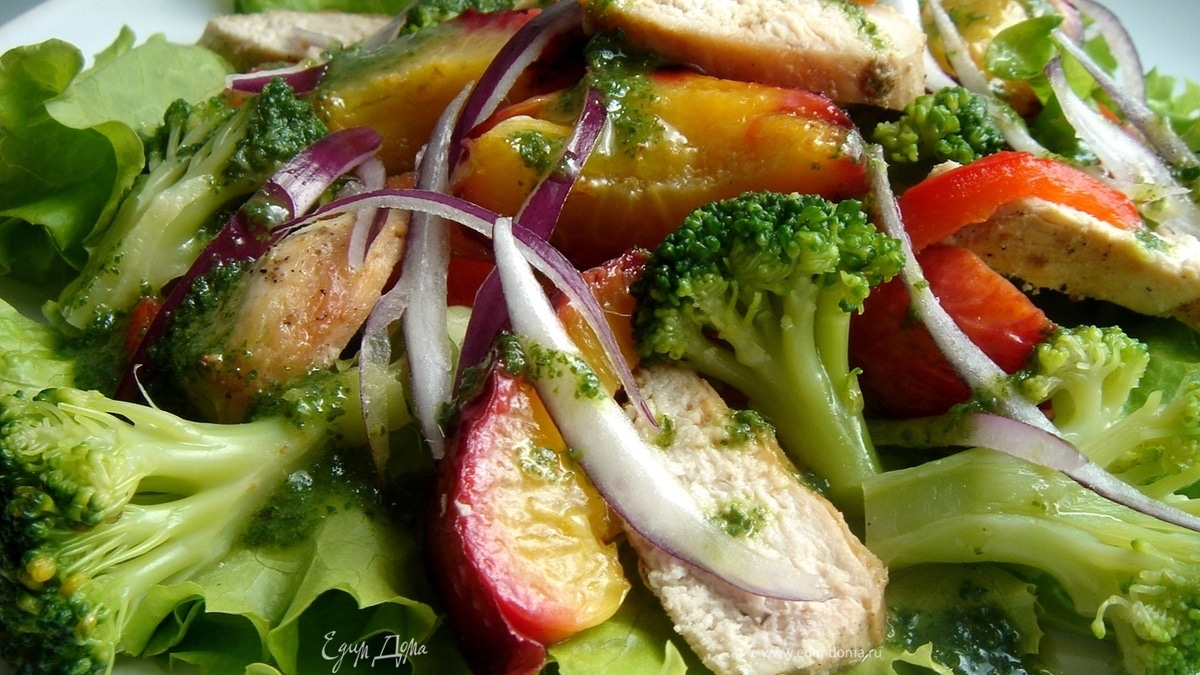Для заправки измельчить и взбить все ингредиенты (мята, оливковое масло, винный уксус, соль, перец) погружным блендером. Лук нарезать полукольцами. Болгарский перец, нектарины, брокколи, лук и курицу смешать с заправкой.