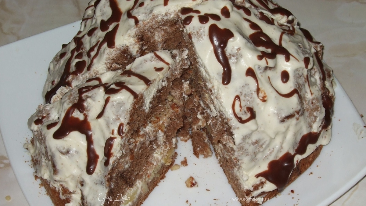 - Шаг 11. Отделить белки от желтков. Белки взбить в крепкую пену. 2. Продолжая взбивать, ввести 2 стакана сахара. 3. Вести яичные желтки (по одному). 4. Какао всыпать в тесто через сито, чтобы не было комочков. 5. Затем в несколько приемов добавить муку и разрыхлитель. 6. Вылить тесто в смазанную маслом форму, выпекать при 180 градусах до готовности. 7. От готового остывшего бисквита отрезать корж высотой 1,5-2 см. 8. Оставшуюся часть порезать кубиками в 3-4 см. 9. Сметану взбить. Взбивать около 10 минут, пока она не станет пышной и воздушной массой, вбить 1 стакан сахарного песка, взбивать около 5 минут. 10. Смазать корж сметанным кремом. 11. Выложить нарезанные ананасы и измельченные орехи. 12. Каждый кусочек теста обмакивать в крем и выкладывать на торт. 13. Затем опять ананасы, орехи и кусочки теста - укладываем тортик. 14. Залить торт сметанным кремом. 15. На водяной бане растопить шоколад и нанести желаемый рисунок. УДАЧИ!!!
