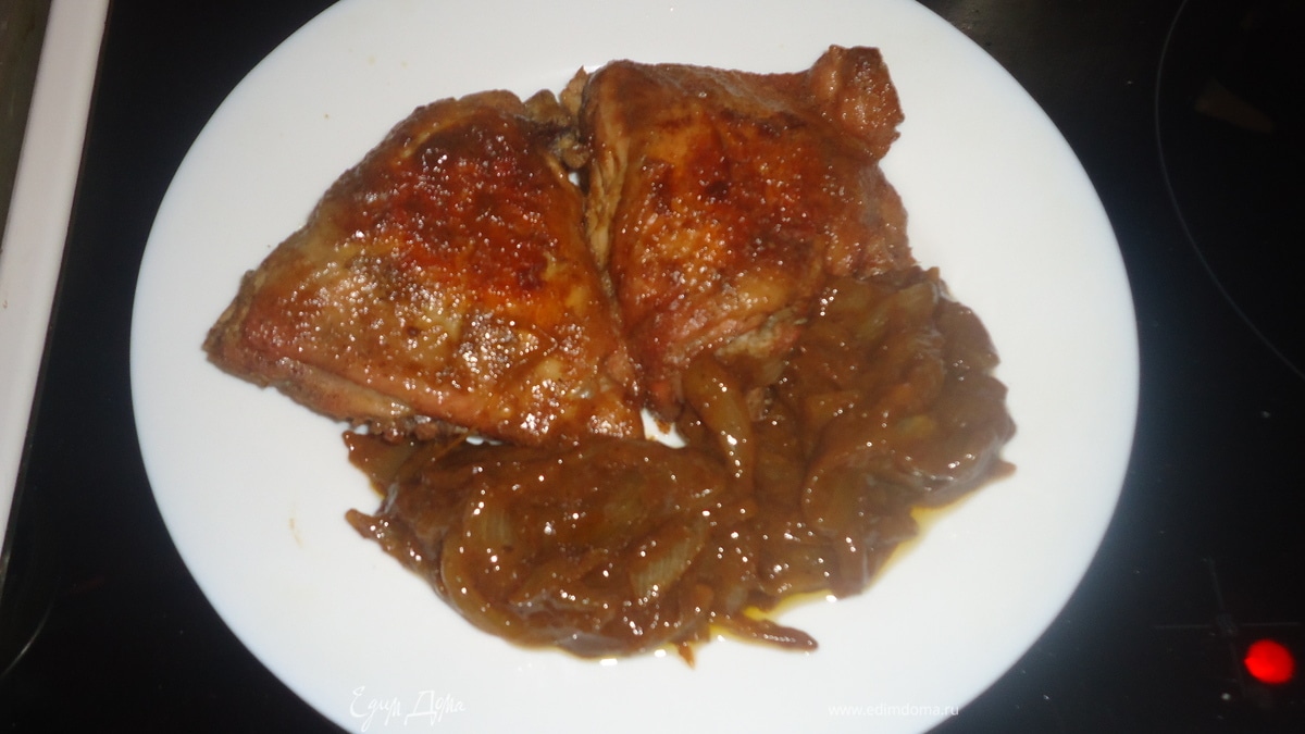 Когда бедрышки будут готовы, выкладываем на тарелку, а на этой сковородке, где жарились бедрышки, обжариваем лук. Лук почистить и порезать перьями, обжарить до готовности и выложить рядом с бедрышками.
