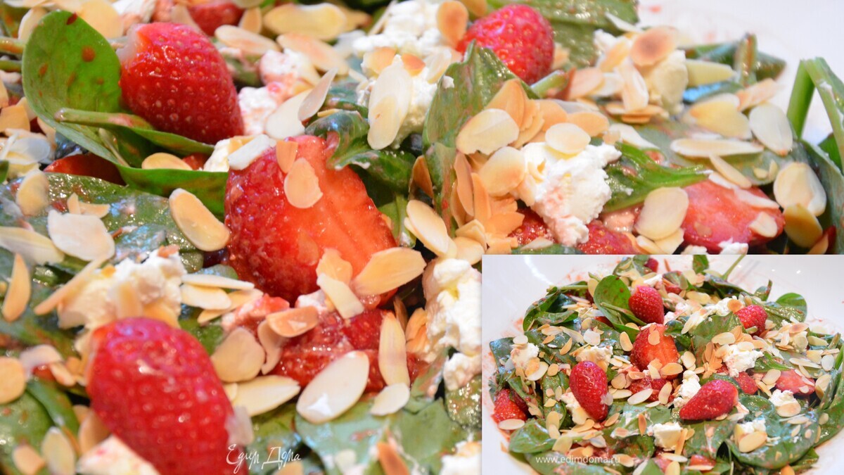 - Шаг 3В большой салатник выложите шпинат, нарезанную клубнику и сыр (сыр выкладываете маленькой ложечкой. а фету порежьте на кубики) осторожно пермешайте. полейте клубничным соусом. Украсьте салат листочками миндаля и подавайте.