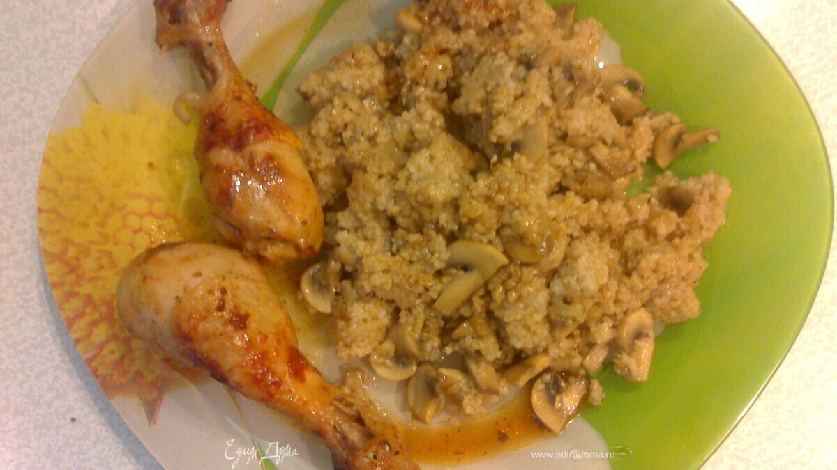 Выкладываем на тарелку а к ней можно подать и мясо и курицу и наверно даже жареную рыбу. В моем случае это куриные ножки которые я вымыла, высушила, натерла солью и перцем и запекла в рукаве в духовке. По времени они стояли ровно столько сколько готовился гарнир из ячки и грибов. Надеюсь, вам понравится, принятого аппетита !
