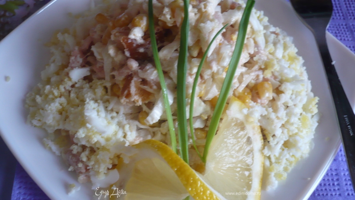 - Шаг 1Сёмгу отварить,порезать кубиками. Капусту,верхнюю часть,нашинковать. Из хлеба белого или батона нарезать сухариков и поджарить. Яйца отварить,почистить и натереть на тёрке. Сметану смешать с майонезом,можно добавить горчицы,сок лимона.Соединить все ингредиенты,заправить соусом. Выложить горкой на блюдо при подачи.По желанию можно добавить маслины вместо яиц.
