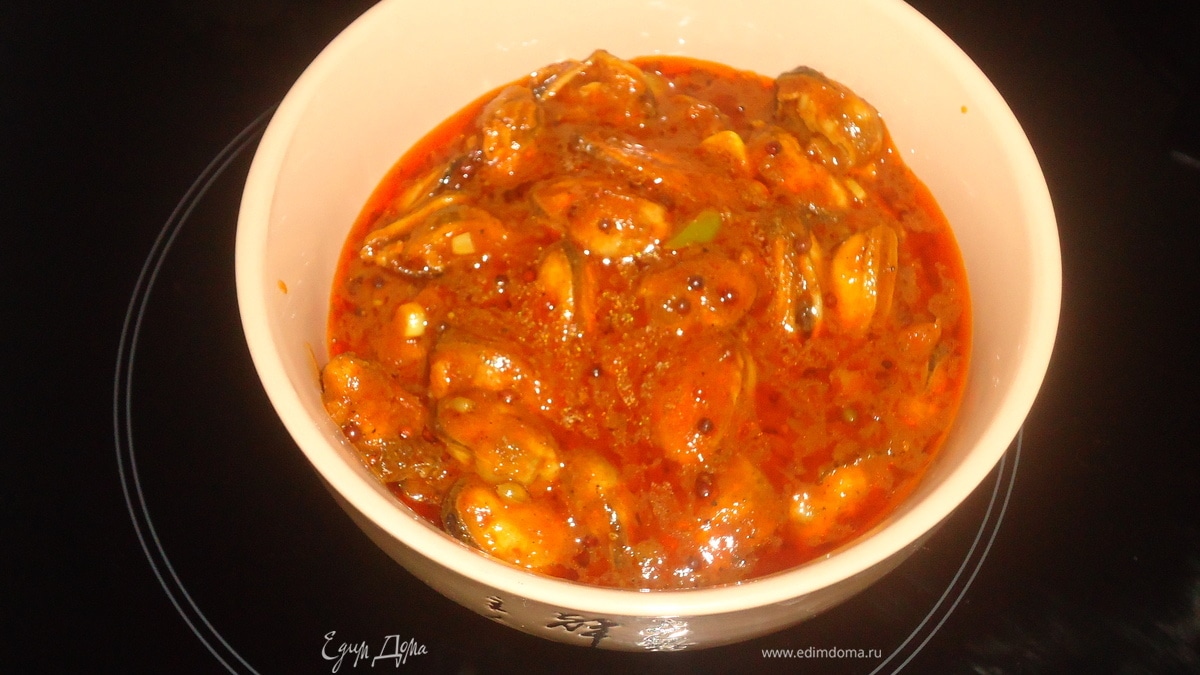 - Шаг 4в разогретую кастрюлю высыпаем все приправы: зиру растереть в руке и обжарить, потом добавляем имбирь, чеснок и перец чили и перемешиваем. потом добавляем томатную пасту и обжариваем. добавляем немного воды и мидии, солим и перчим по вкусу и готовим минут 5-10.
