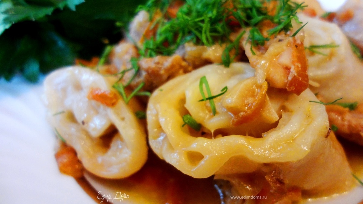 При подаче выложить на тарелку манты, сверху поджарку с подливой, украсить зеленью по желанию. - Шаг 7