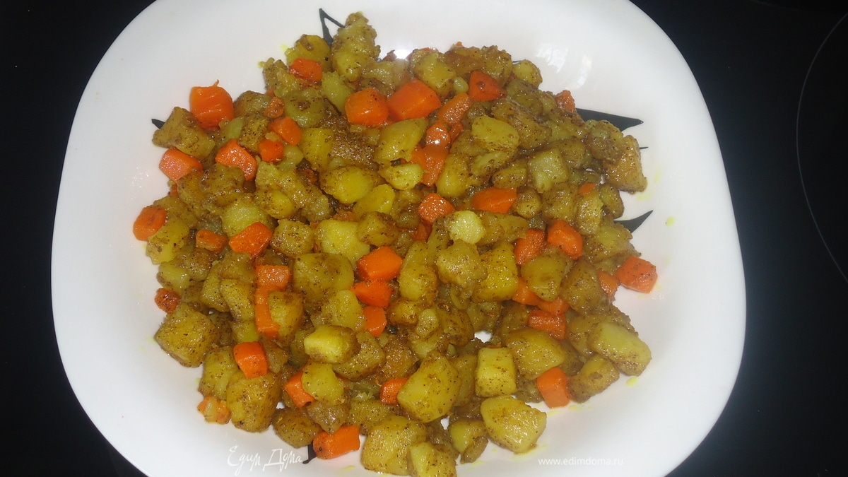 Когда картошка и морковка будут почти готовы, добавляем карри и черный перец, соль по вкусу, хорошо перемешиваем и доводим до готовности.