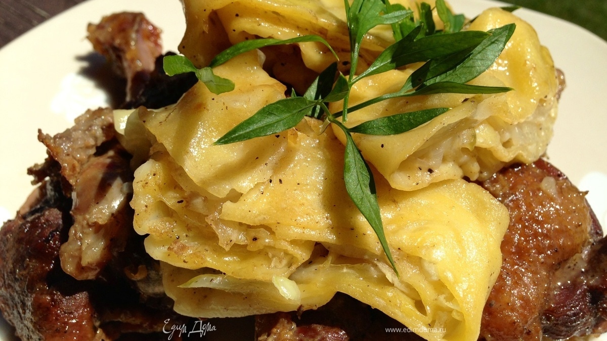 Пока тушиться утка, из муки, яйца, воды и соли приготовить тесто. Тесто должно получиться как для пельменей... - Шаг 5