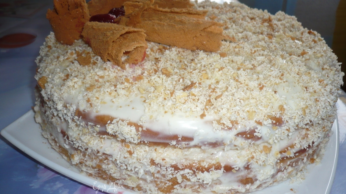 - Шаг 1Тесто:Яйца взбить с сахаром до полного растворения сахара.Добавить йогурт,ваниль.Муку просеять с разрыхлителем и замесить тесто.Выпекать в заранее разогретой духовки до 200С,30мин. Начинка:Клубнику разморозить,а конфеты заморозить и измельчить. Крем:Обычным способом.Я ещё добавляю лимонного сока 1ст.л. Пропитка:Сок от клубники соединить с сахаром,подогреть до полного растворения сахара и добавить коньяк. Сборка торта:Бисквит разрезать на три части.Первую пропитать смазать кремом и выложить ягоды.Накрыть вторым.Пропитать его тоже и выложить измельчённые конфеты,накрыть третьим.Верхний не пропитываем,а просто намазываем кремом и посыпаем крошкой с кокосовой стружкой.