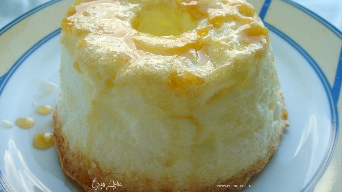 Теперь готовим сам пудинг. Для этого белки взбить до мягких пиков. Не останавливая миксера добавить по 1 ложке сахар (с ванилином), а затем тонкой струйкой и оставшийся карамельный сироп. Хорошо взбитую белковую массу выложить в форму так, чтобы избежать зазоров. Поставить форму в духовку в горячую водяную баню. Выпекать пудинг около 10-15 минут (десерт должен хорошо подняться и приобрести приятный карамельный цвет). Затем выключить духовку и приоткрыть дверцу. Выдержать десерт ещё 15 минут в духовке.