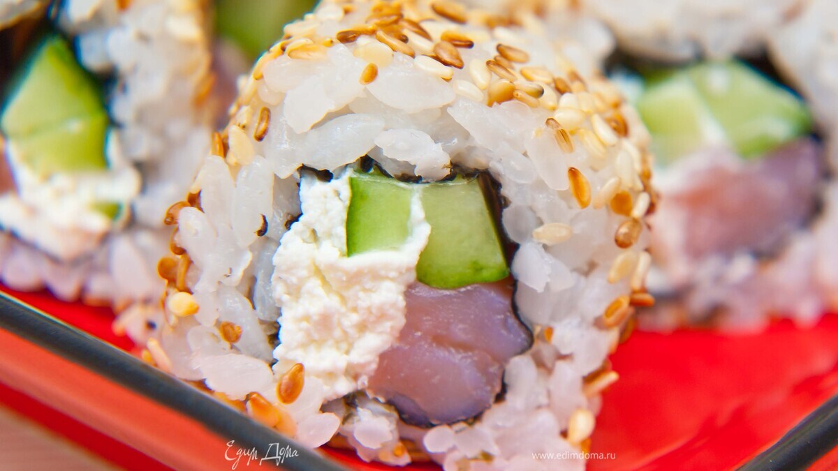 - Шаг 3Приступаем с скручиванию роллов. На циновку кладем 1/2 листа нори и отступив от себя 2 см выкладываем рис (руки каждый раз, перед таем как взять порцию риса смачиваем в воде) Стараемся выкладывать рис заходя за пределы листа нори см на 2. Переворачиваем. Выкладываем сначала сыр, потом огурец и рыбу и начинаем аккуратно сворачивать ролл. Когда ролл будет свернут, покрываем его кунжутом. Разрезаем на 8 частей и подаем. Приятного аппетита!