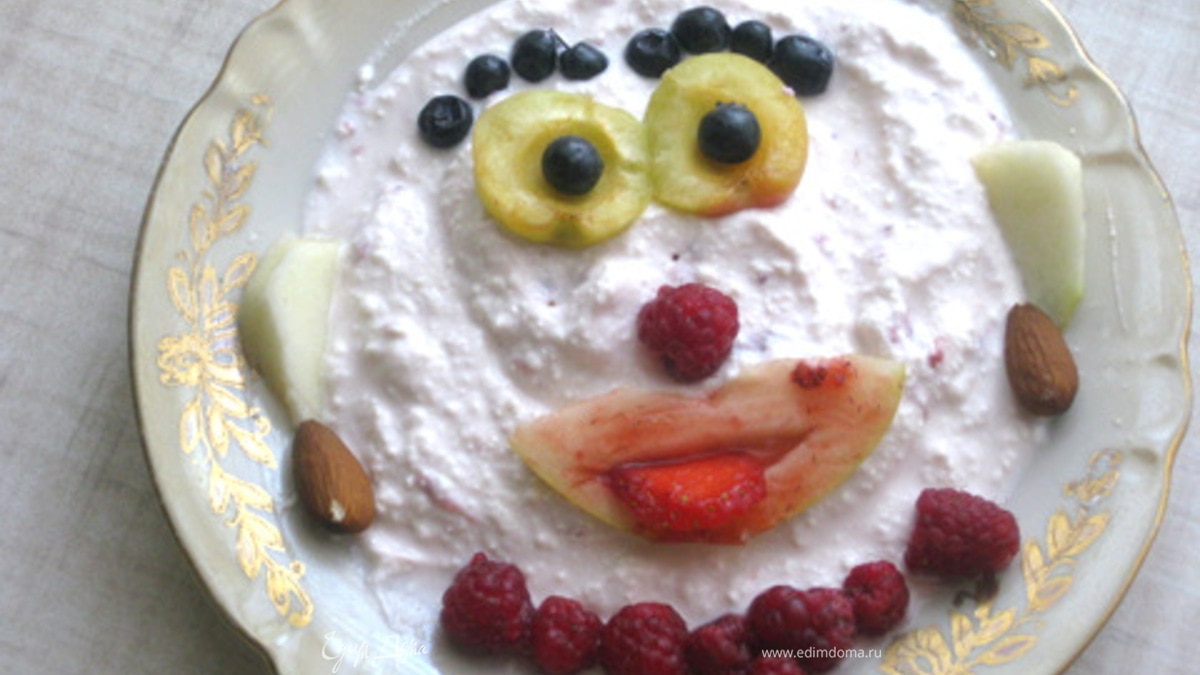 Такой весёлый творожный крем я ела на завтрак! Он оказался не только красивым, но и очень вкусным и полезным! В нём много калия и кальция, а также витаминов и минералов, ведь в нём сезонные фрукты и ягоды. И свежий майский мёд!