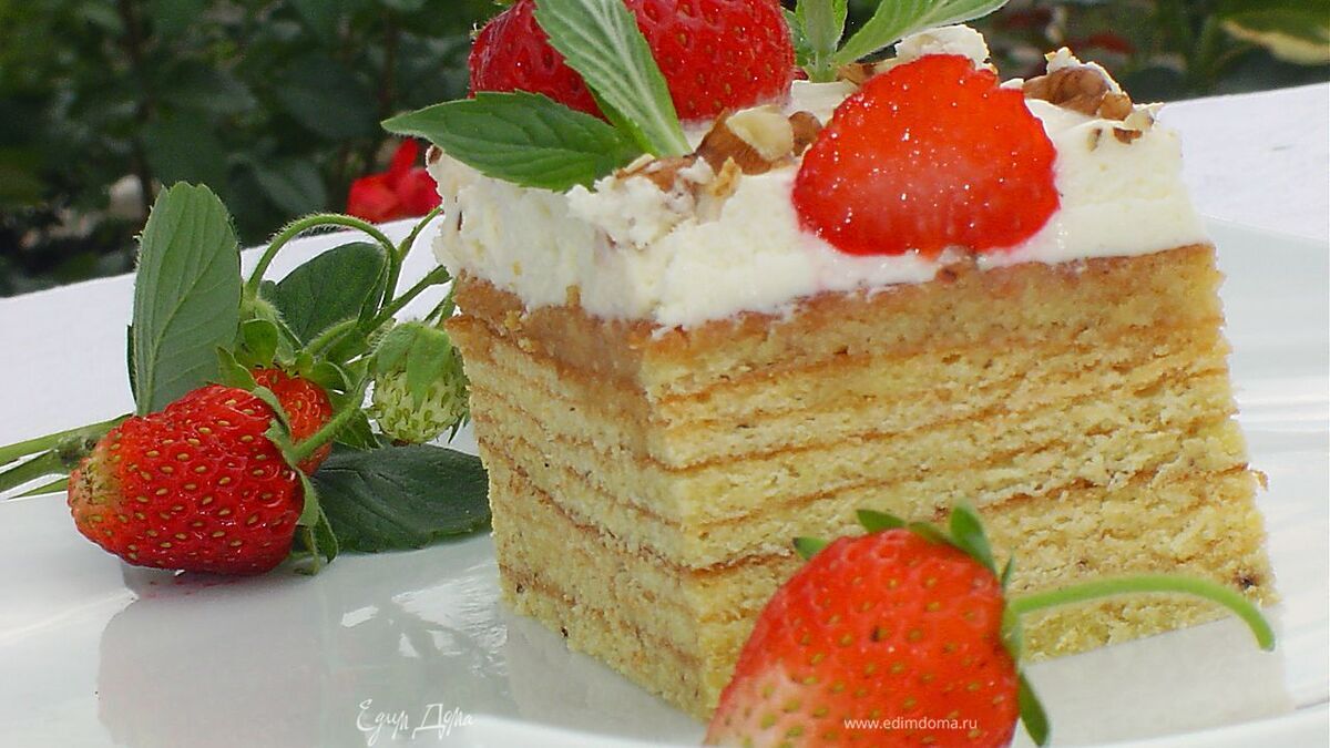 Основа этого торта - знаменитый немецкий пирог "Baumkuchen" (в переводе - "деревянный пирог"), а сметанный крем с клубникой дают ему новое дыхание, да такое вкусное, которое просто необходимо попробовать!