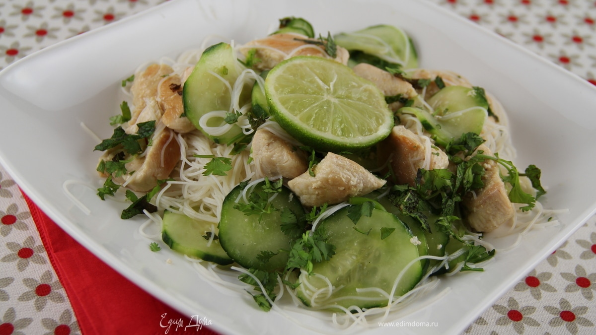Салат из рисовой лапши с курицей и огурцами в азиатском стиле