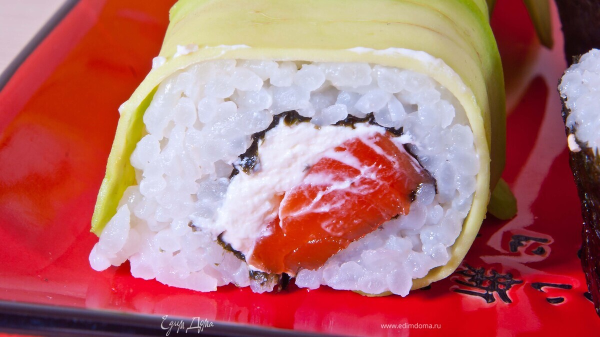 - Шаг 2Приступаем с скручиванию роллов. На циновку кладем 1/2 листа нори и отступив от себя 2 см выкладываем рис (руки каждый раз, перед таем как взять порцию риса смачиваем в воде) Стараемся выкладывать рис заходя за пределы листа нори см на 2. Переворачиваем. Выкладываем сливочный сыр, форель и начинаем скручивать ролл. После того как ролл свернули раскладываем пласты авокадо по всей длине ролла и прижимаем циновкой. Дале разрезаем пополам и потом каждую половинку разрезаем на 2 части. Приятного аппетита!