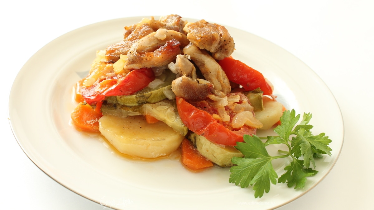 Очень вкусное и ароматное блюдо. Мясо для этого блюда маринуется как для шашлыка. Лучше использовать свиную шейку или нежирную грудинку. Но можно также и постную вырезку. Главное, чтобы мясо было не жесткое, более мягкое. Овощи тоже можно выбрать по своему вкусу.
