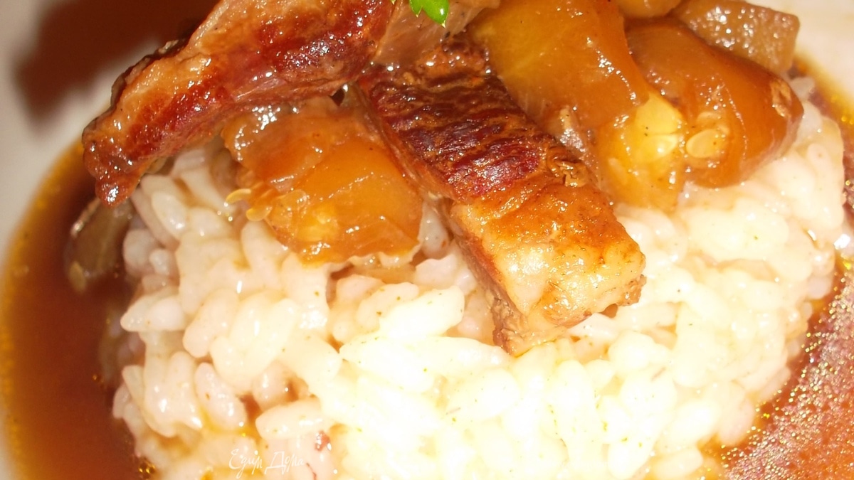 Свинина в соевом соусе с овощами на рисовой подушке