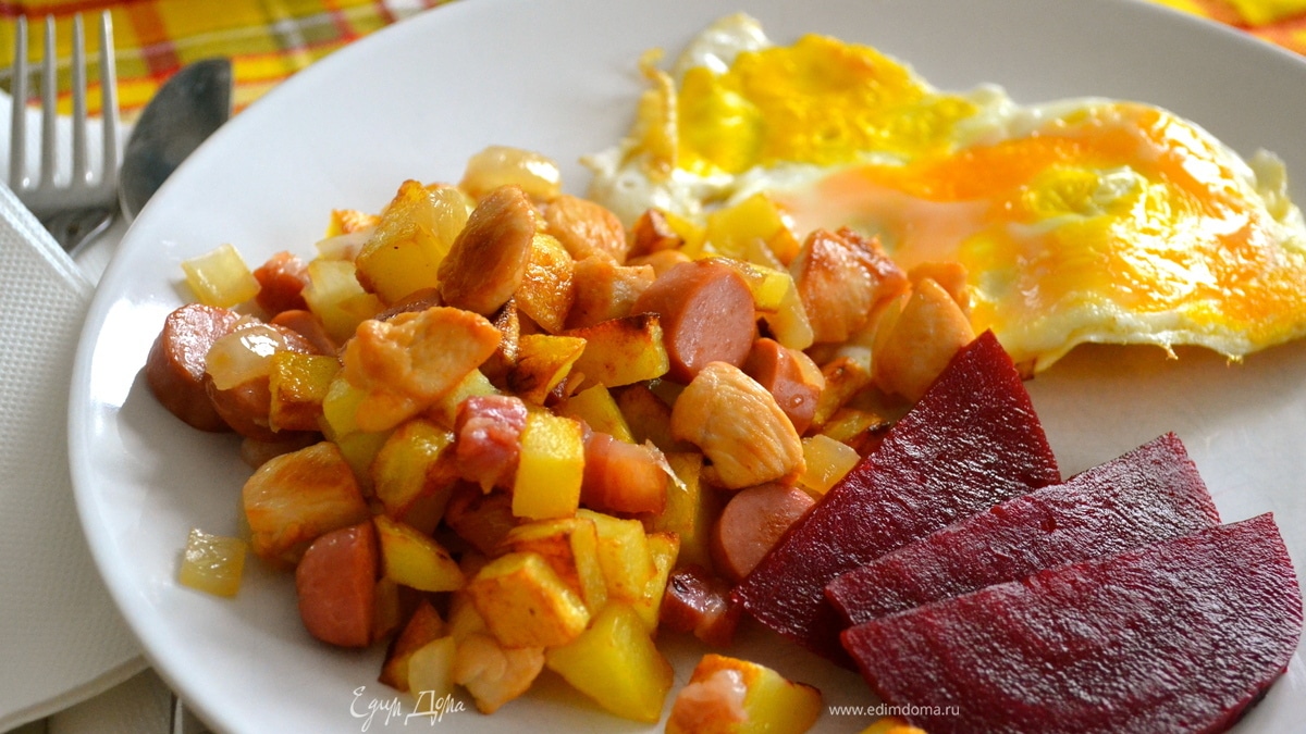 Поджариваем яйца (из расчета одно яйцо на человека - на блюдо). И подаем на стол!!! В качестве сопровождающего гарнира к этому блюду кладут маринованную свеклу и огурчики. У меня отварная свекла и...без огурчиков...на этот раз! ))) - Шаг 7