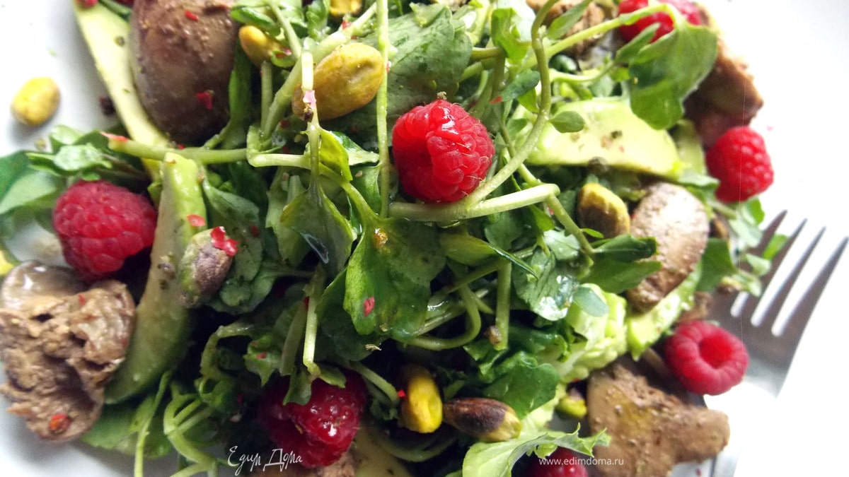 Салат с печенью, авокадо, малиной и фисташками