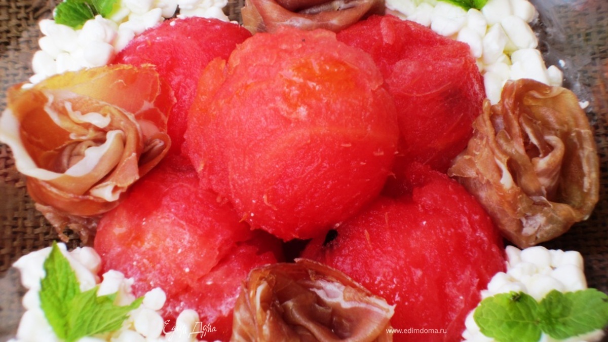 Салат с пармской ветчиной, арбузом и зерненым творогом
