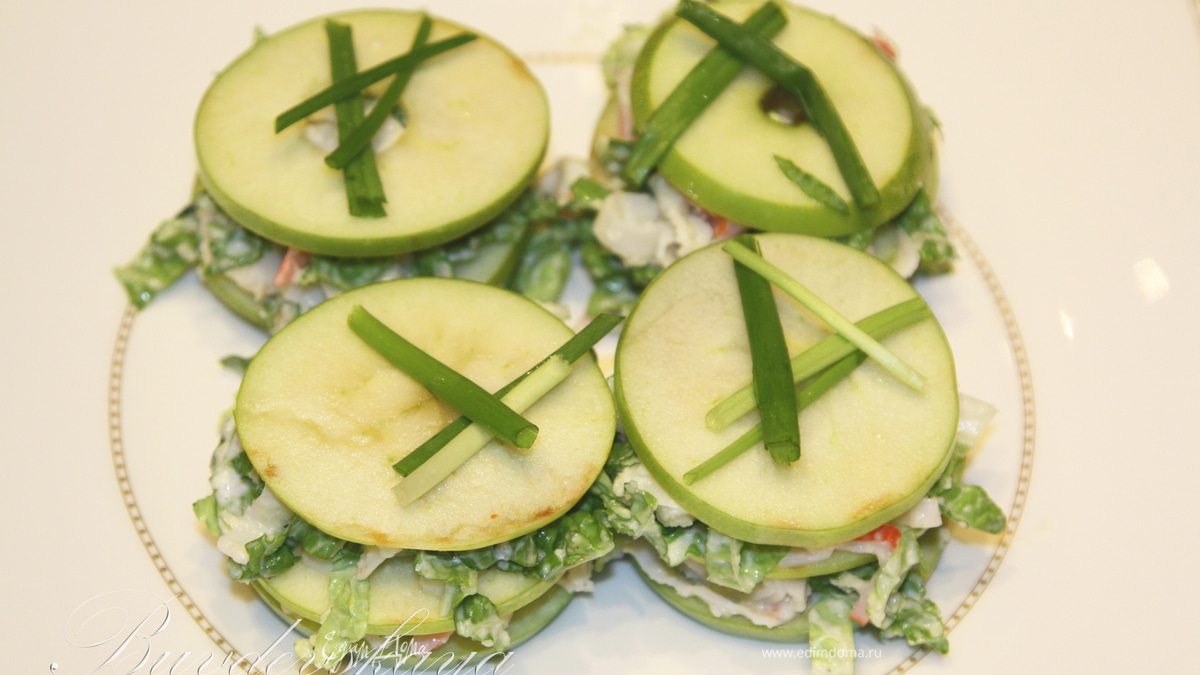 - Шаг 2Перемешать крабовое мясо, лук, капусту и приготовленную заправку. Положить на тарелки по 1 кружку яблок, выложить по 1,5 ст. л. салата. Накрыть вторым кружком, разложить оставшийся салат. Накрыть оставшимися кружками, украсить по вкусу и сразу же подавать. ENJOY !